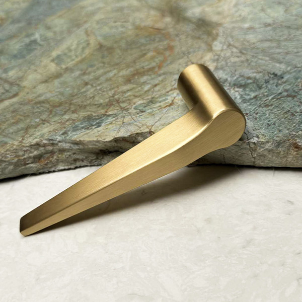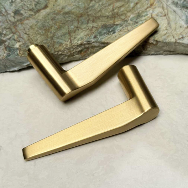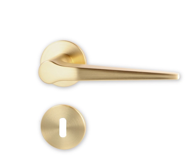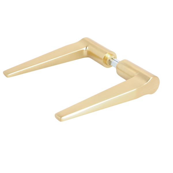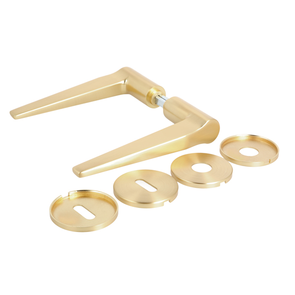 Zamak Door Handle "Funk", Brushed Brass, 8x8x95mm Split Spindle, Incl. Round Spring Rosettes, Oval Key Hole Escutcheons, Hex Key, Wooden Screws, M4 Connecting Screws & Washers. cc: 38mm. Door Thickness: 38-50mm.