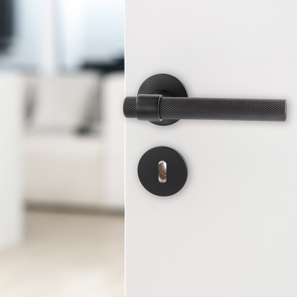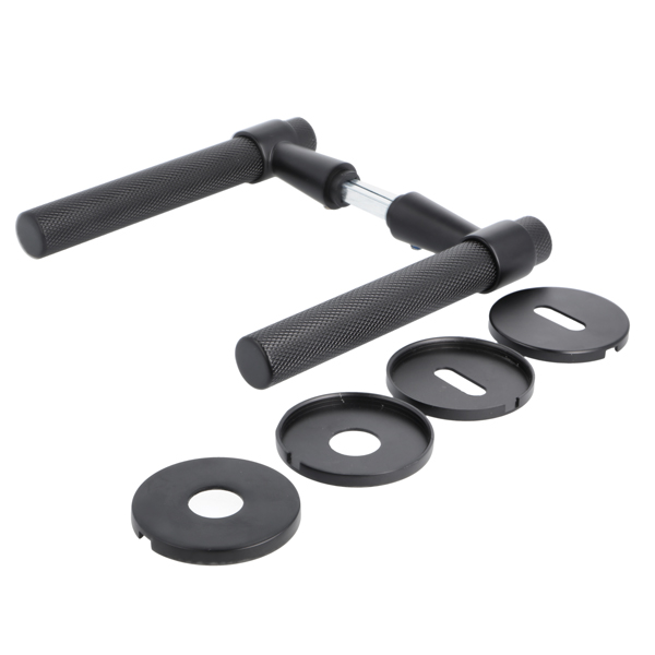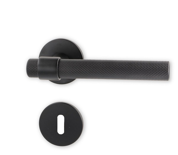 Zamak Door Handle "House", Black Finish, 8x8x95mm Split Spindle, Incl. Round Spring Rosettes, Oval Key Hole Escutcheons, Hex Key, Wooden Screws, M4 Connecting Screws & Washers. cc: 38mm. Door Thickness: 38-50mm.