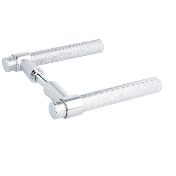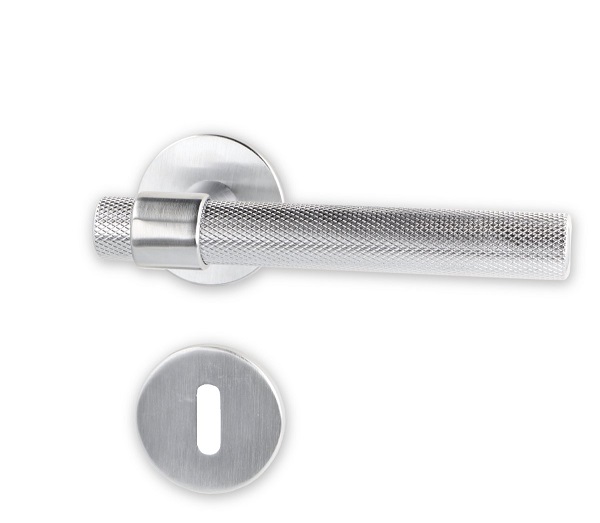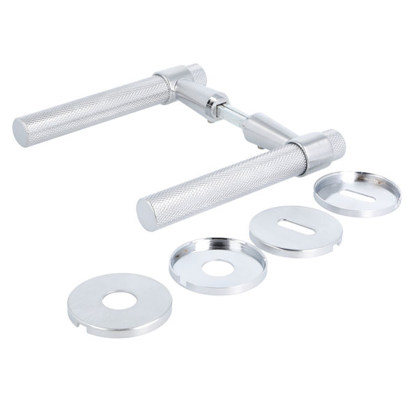 Zamak Door Handle "House", SS-Look, 8x8x95mm Split Spindle, Incl. Round Spring Rosettes,Oval Key Hole Escutcheons, Hex Key, Wooden Screws, M4 Connecting Screws & Washers. cc: 38mm. Door Thickness: 38-50mm.