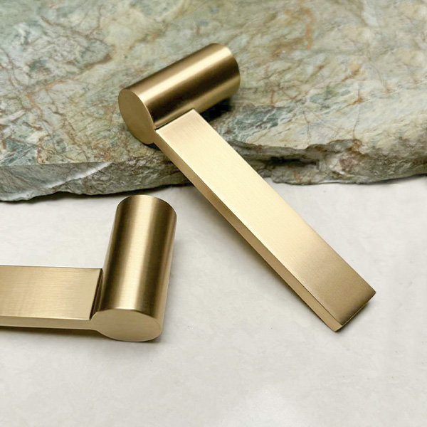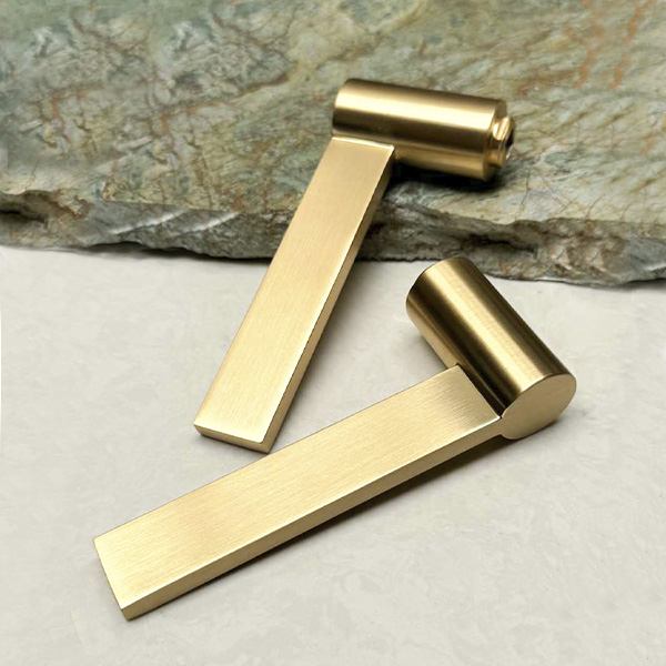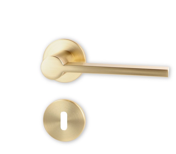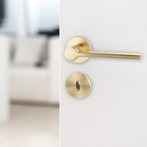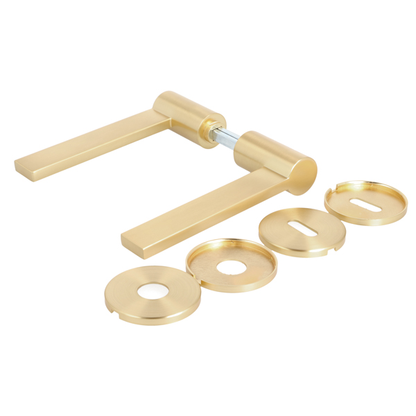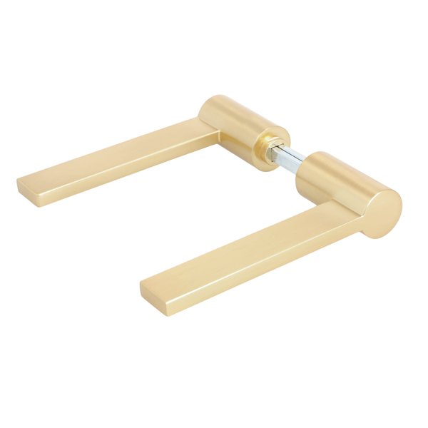 Zamak Door Handle "Rock", Brushed Brass, 8x8x95mm Split Spindle, Incl. Round Spring Rosettes, Oval Key Hole Escutcheons, Hex Key, Wooden Screws, M4 Connecting Screws & Washers. cc: 38mm. Door Thickness: 38-50mm.