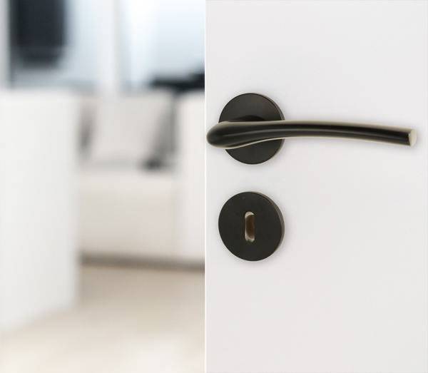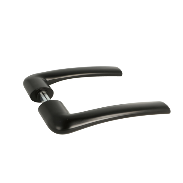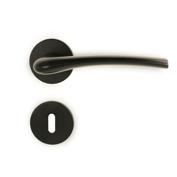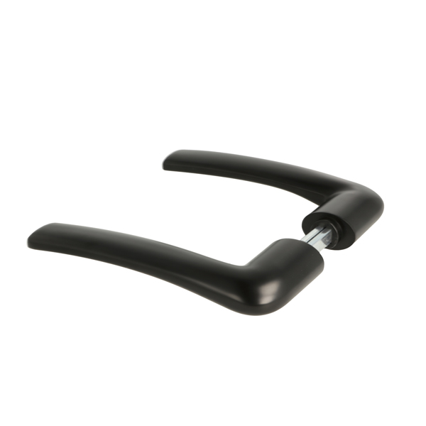 Zamak Door Handle "Trance", Black Finish, 8x8x95mm Split Spindle, Incl. Round Spring Rosettes, Oval Key Hole Escutcheons, Hex Key, Wooden Screws, M4 Connecting Screws & Washers. cc: 38mm. Door Thickness: 38-50mm.