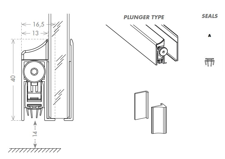 Drop Down Black Alu Profile, "A" ,F/Glass Doors,930mm, W/Ad- hesive Tape, 40mm Profile Height, 14mm Drop Function,Can be shorten 150mm on the opposite Side to the Plunger, Tested to 200.000 closing Cycles, Black Anodized, 4 Fins Thermoplastic Seal (A)