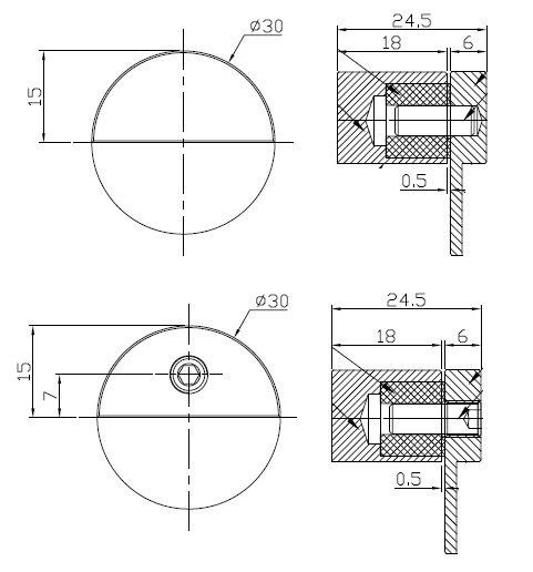 Pivot Hinge F/UV-Glue, ø30mm, SS-304-Brushed, F/Max 12mm Glass Thickness, Max Load Capacity: 10 KG, F/Inset Doors, A threaded Pin in the Hinge allows the Door to be removed after gluing