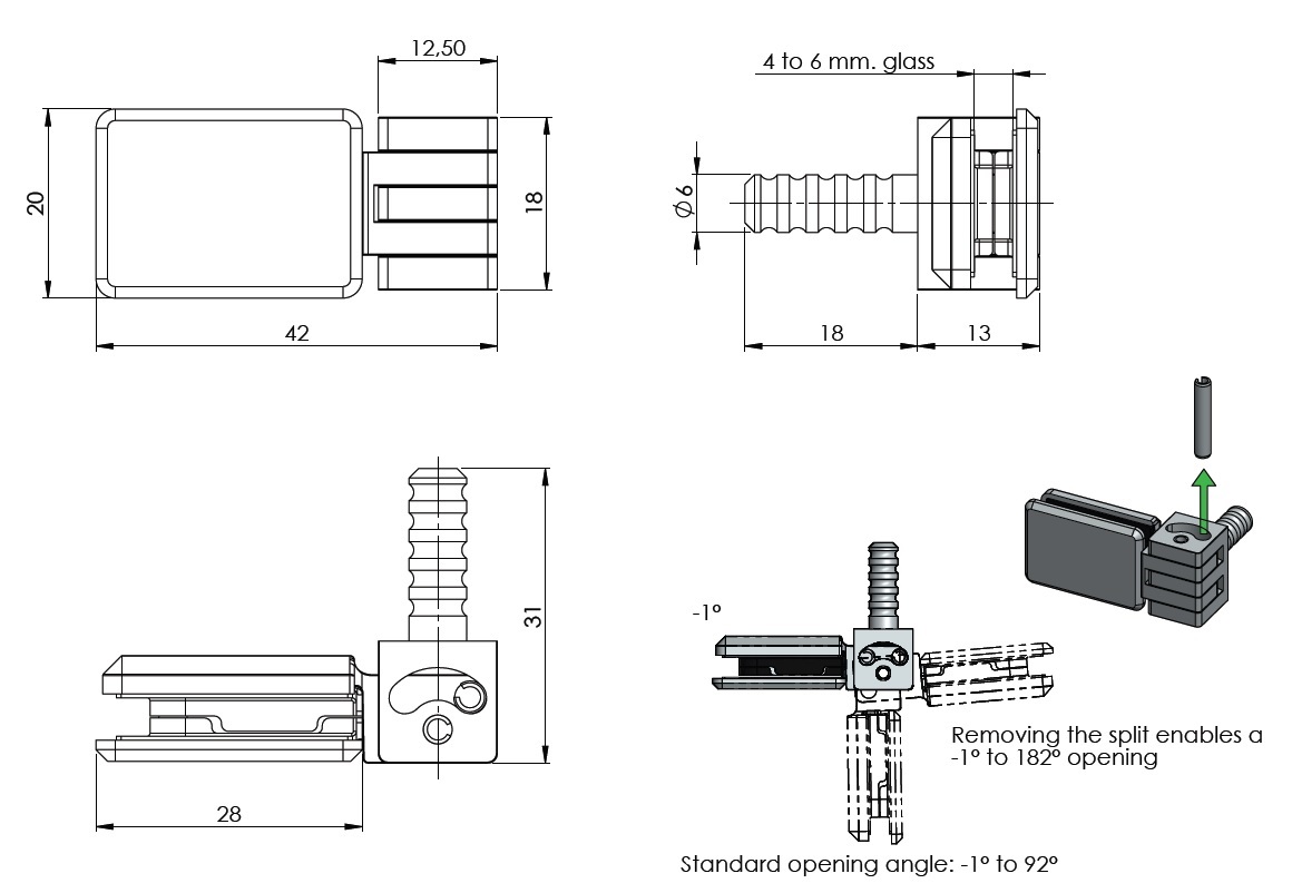 Door Hinge "Bonsai", Wood/Glass or Wood/HPL, Brass Polished For 4-6mm Glass Door & 12mm Cabinet Side, 92/182DG Opening, Load Capacity: 5 kg. Per Hinge, Max Door Size: 600x2000x6mm
