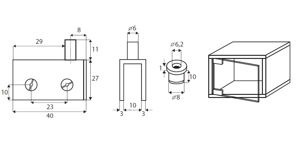 Glass Pivot Hinge 40x27x3mm 4-8mm Glass, Brass Alu, W/PZD Screws, Max Door Weight Per Pair 8 Kg, Max Door Size 500 x 800mm