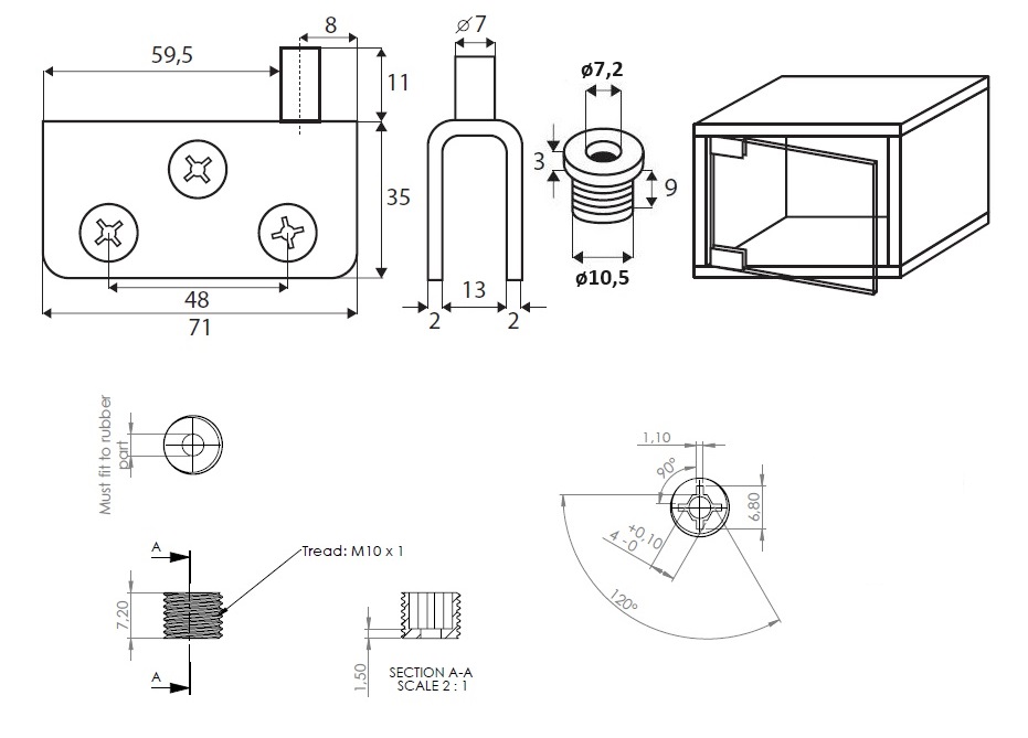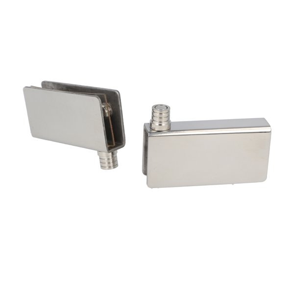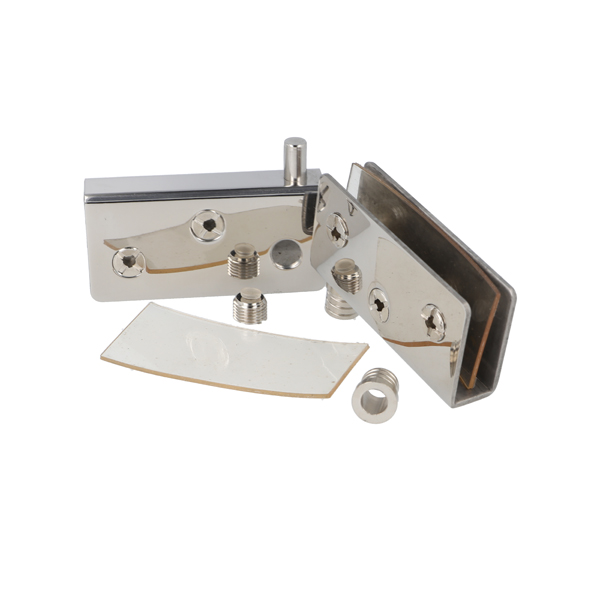 Glass Pivot Hinge "L", 71x35x2mm,10mm Glass,SS-304 Polished, W/ø10x9mm Brass Bushing & Screws W/Soft Tip, All SS-look
