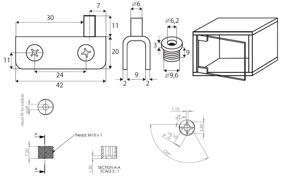 Glass Pivot Hinge "S", 42x20x2mm, 6mm Glass,SS-304 Polished, W/ø9x8mm Brass Bushing & Screws W/Soft Tip, All SS-look