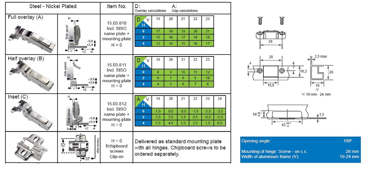 Alu Frame Hinge "B", Clip-On, 100DG, NPL, H=0, W/Plate F/ Wood Screws , Half-Overlay, W/SISO DK Name Plate, No Screws, F/19-24mm Alu Frames, cc:28mm On Hinge Head
