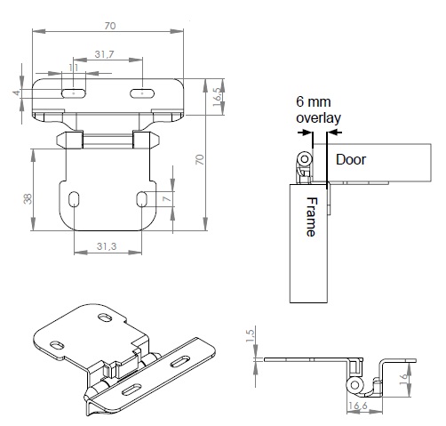 Self Closing Hinge "Forte" 6mm Overlay, Steel-Bronze Pl.