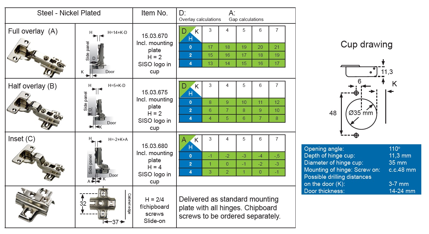 Maxi Hinge, Steel, NPL, 110DG, B/9mm Half-Overlay, With Mouting Plate H:2mm F/Chipboard Screws, ø35mm Cup, cc:48mm - 6mm, Cup Height: 11,3mm, NPL, Slide-On