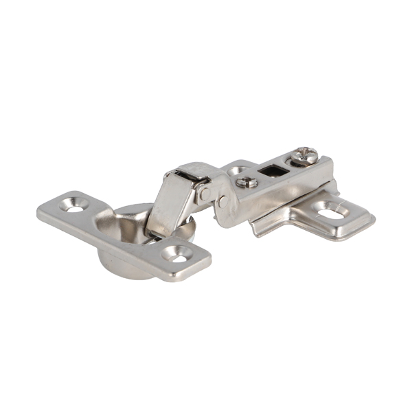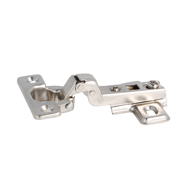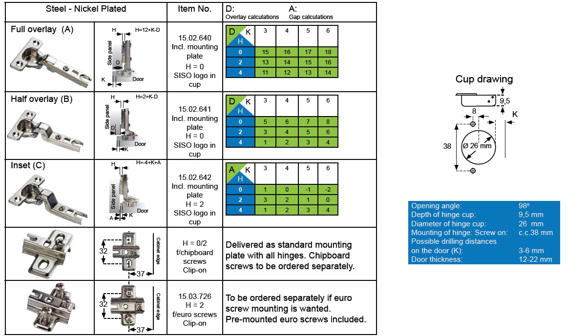 Mini Hinge, Steel, NPL, 98DG, B/09mm Half-Overlay,W/Mounting Plate H:0mm, F/Chipboard Screws, ø26mm Cup cc:38mm - 8mm Cup Height 9,5mm, W/SISO DK Logo In Cup, Slide-On