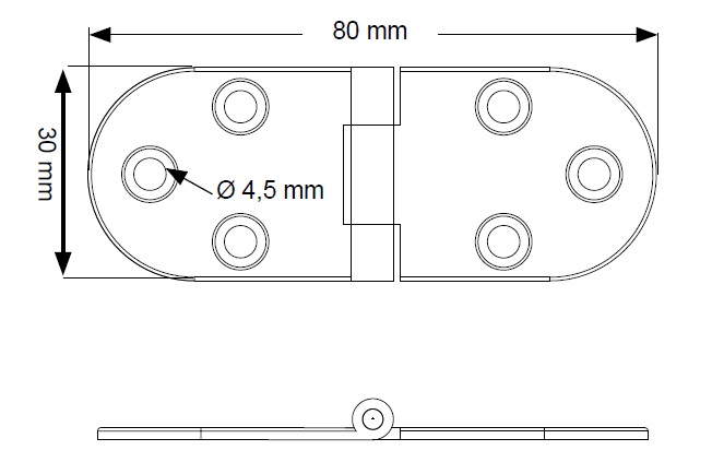 Flap Hinge, Brass, 30x80x2mm, Polished, W/CSK ø4,5mm Holes