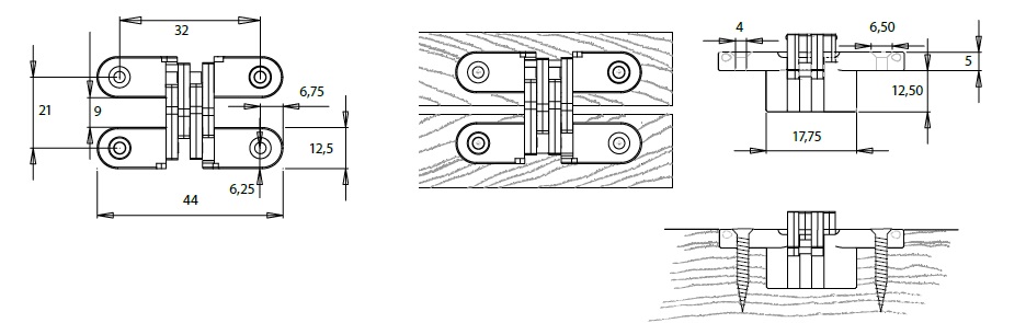 Vici Hinge, 44x13mm, Zamak Body,Steel Linkage,Yellow Zinc Pl