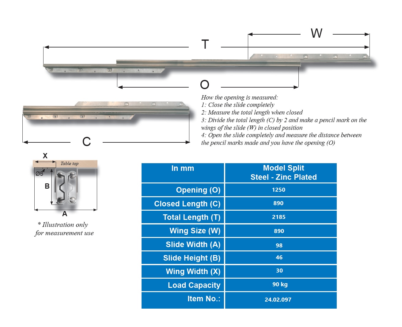 Table Slide, Split "Steel/Alu",1250mm Opening,H 46mm,Silver Painted, Closed Lenght:890mm,Wing Size:890mm,Total Lenght When Open: 2185mm, Profile: 46mm, Load Capacity 90 Kg