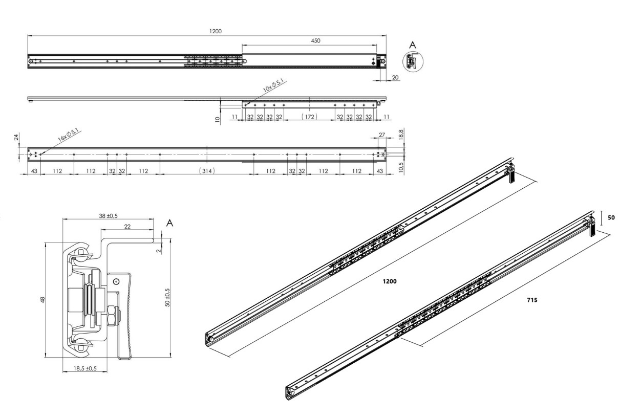 Table Slide. 9096/1200, One-Sided Extension, W/Brake, 715mm Opening, Alu Wing & Steel Profile, 90 KG Load Capacity