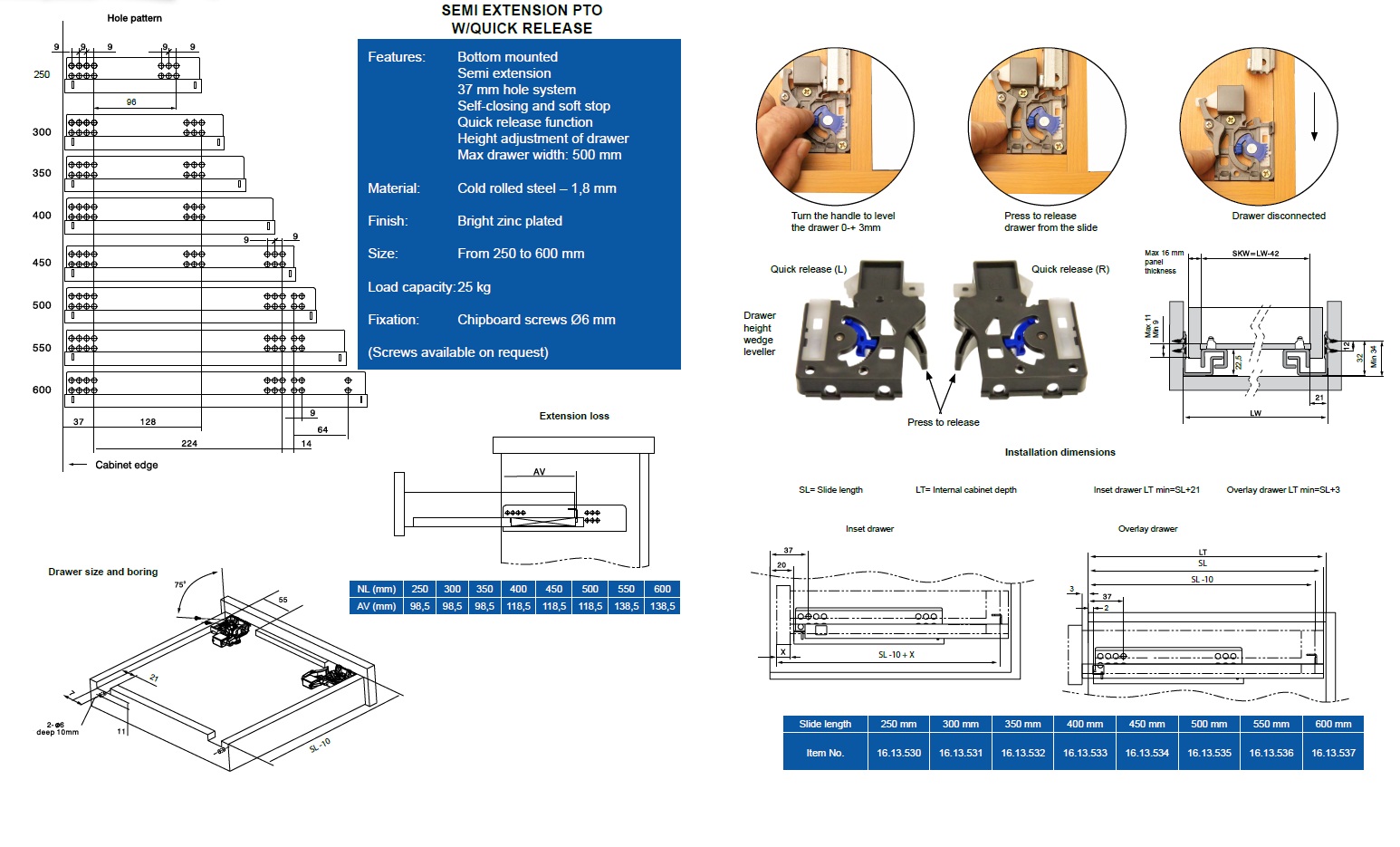 Invis. Semi Ext. Slide, Self closing, Pre-Zinc,250mm,W/Quick Release & Inner Dampers