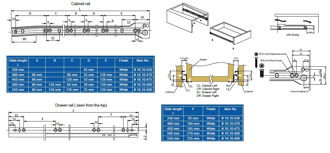 Drawer Slide 6001, 500mm, 1,2mm, White 9003, Bottom Mounted