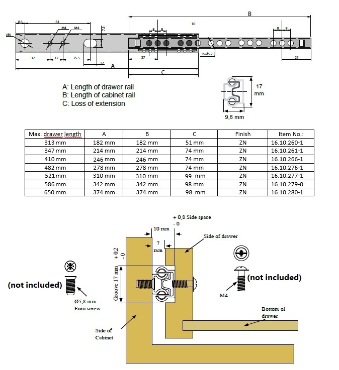 Drawer Slide 8817, 410mm Drawer, 0,8mm (246/246), Zinc Pl.