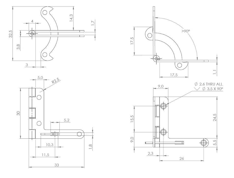 Quadrant Hinge, Steel-BPL, 30 x 33mm, Incl. ø2x8mm Screws
