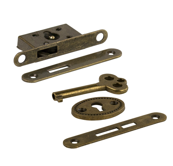 Box Lock, Steel, Bronze Plated, Incl. 1 key, 1 Escutcheon, 2 Striking Plates (Top & Bottom)