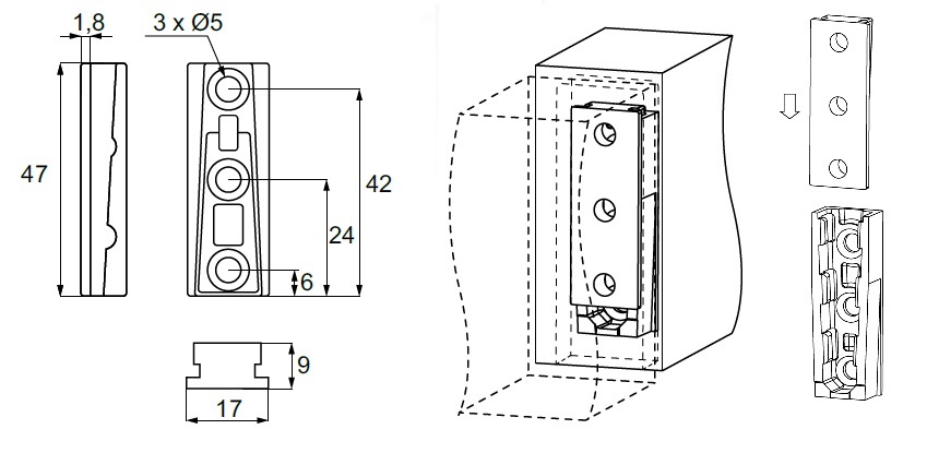 Zamak Connector "Zimak", Male Part, 47 x 17 x 9 mm