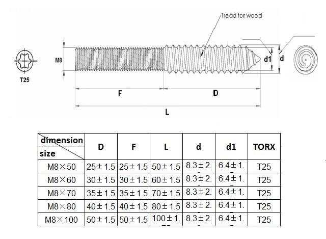 Hangerbolt, Cylindrical, M8x70mm, 50/50, Steel-YZP