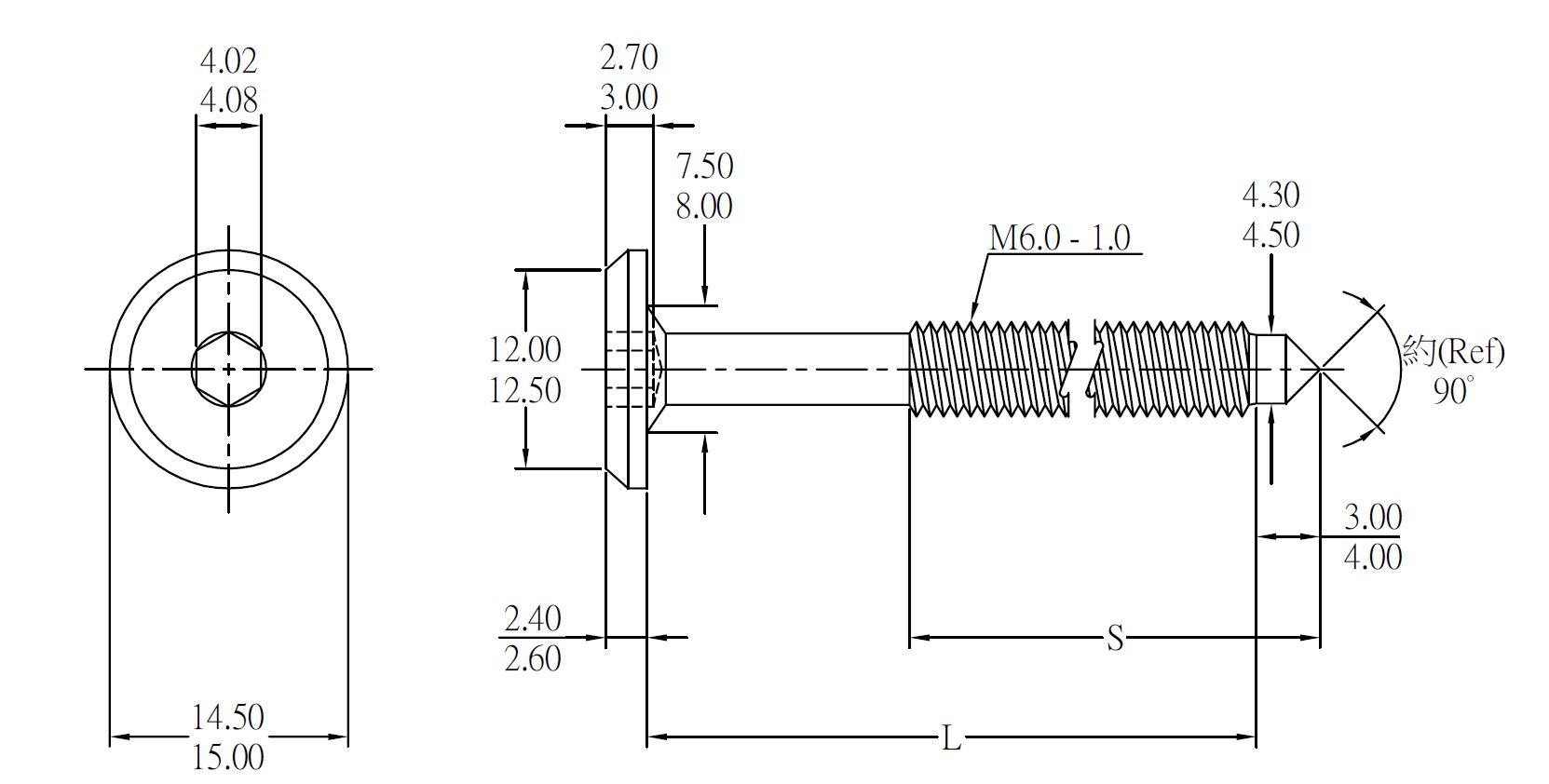 Fifteen Screw, M6x90mm (88+3), YZP, Pointed, (S=49-51mm)