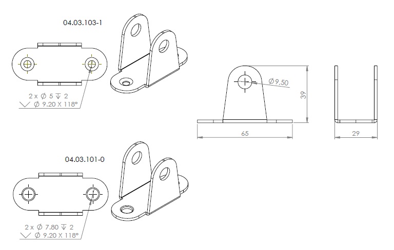 U-Bracket, Flat, AISI 304, Hole ø9.5mm 65x29x39mm For 25mm Wood Thickness, w/CSK Holes in The Bottom Part