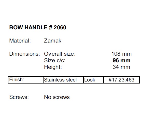 Bow Handle 2060, cc 96mm, Zamak, SS-Look, No Screws