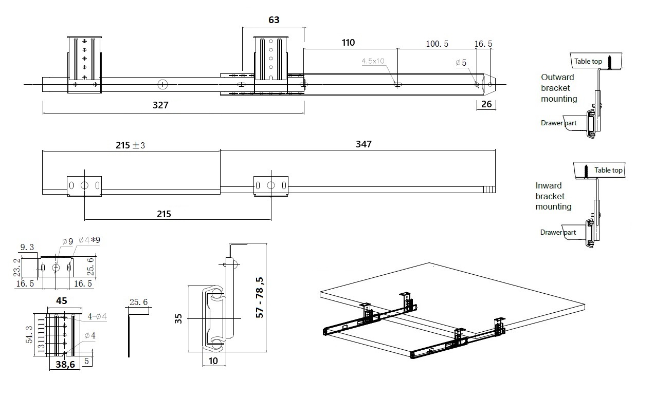 Keyboard Slide NJ2060, 347mm, W/4 Angle Brackets, Black Zinc 35mm Profile Height, 30 KG Load Capacity