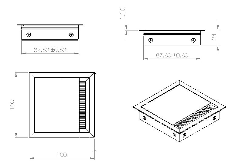 Alu. Grommet "Forro" 100x100x24mm, Anodized, W/Brush, Bumper & Straight Lid, Inner Size 87,6x87,6mm, Tolerance +/-0,6