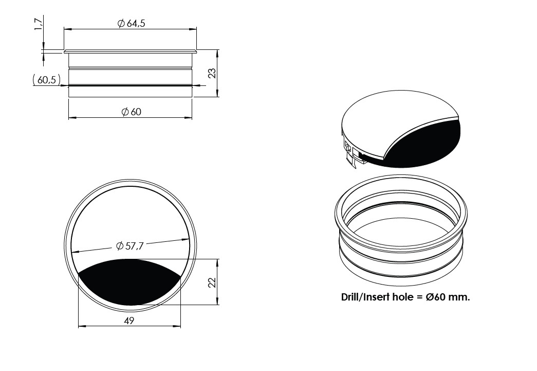 Aluminium Grommet W/Brush, ø60x22mm, Sanded Anodized
