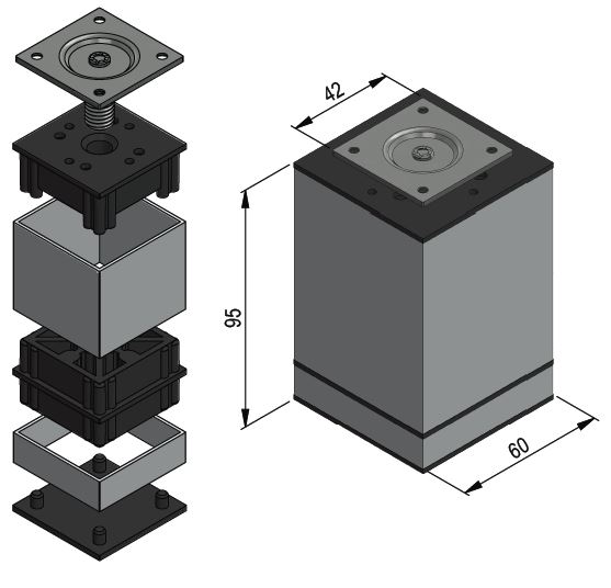 Alu Leg Niko 60x60mm, H 100mm PL 42x42x2mm, cc 32x32mm Stem: M10X27mm ,Silver Sprayed Finish
