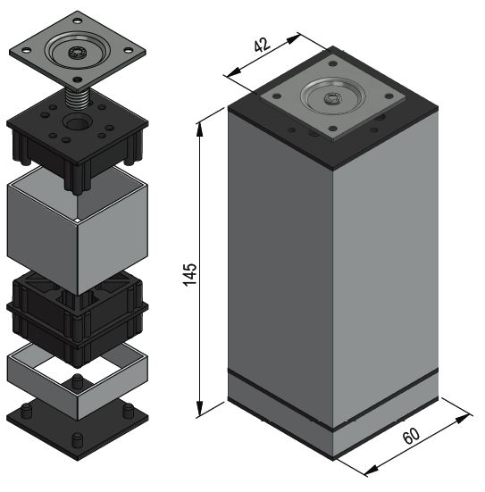 Alu Leg Niko 60x60mm, H 150mm PL 42x42x2mm, cc 32x32mm Stem: M10X27mm ,Silver Sprayed Finish