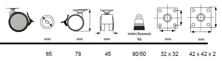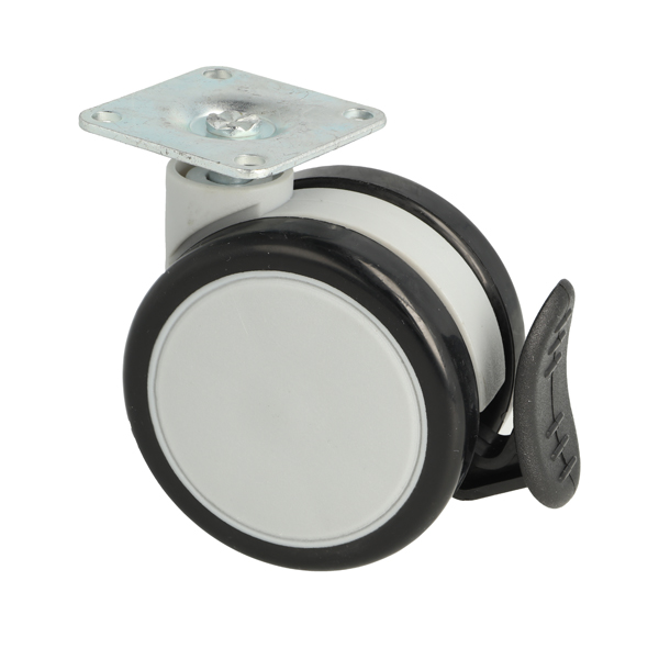 Twin Castor "Bari" ø65mm, W/Brake, Black PU Tyre+Grey PP Core, Top PL:42x42mm, cc::32mm, All Zinc PL, ø5mm Screw Holes, Mounting Height 78mm, Dynamic Load Capacity:50KG, Static:80KG