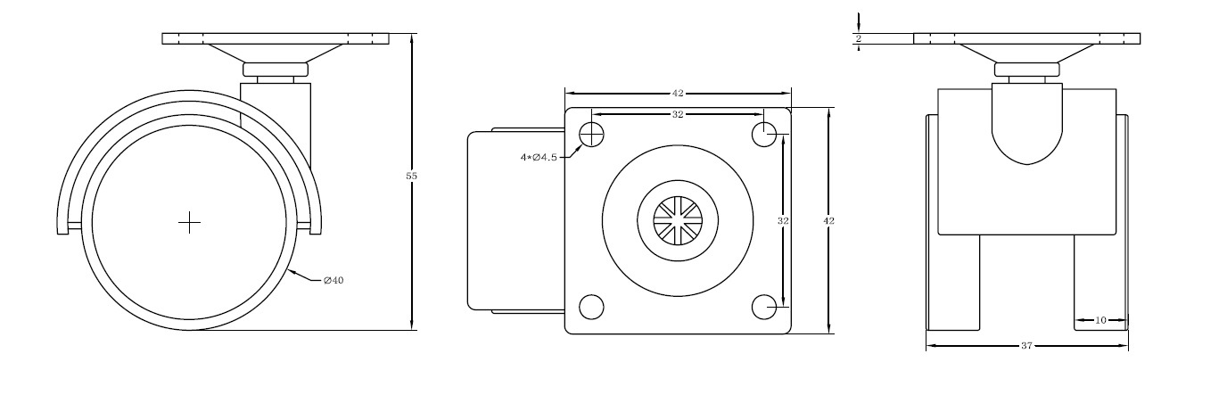Twin Wheel Castor ø40mm, Black PA, Top Pl 42x42x2mm, cc 32x32mm, Mounting Height: 56mm