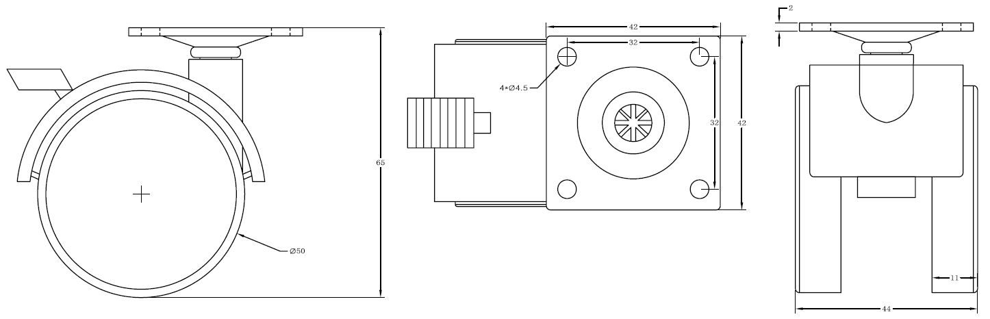 Twin Wheel Castor ø50mm, BLK. PA, W/Brake, Top Pl 42x42x2mm cc:32x32mm,Mounting Height: 65mm