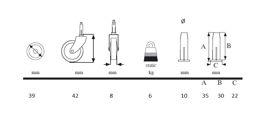 Tea Trolley Castor ø39mm "Titus", NPL, W/Metal Pin ø7 x 35mm & Black Plastic Bushing ø10 x 30 mm