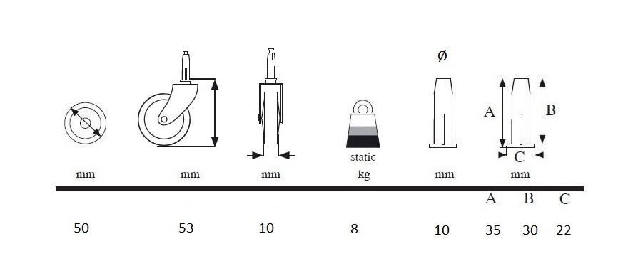 Tea Trolley Castor ø50mm "Titus", NPL, W/Metal Pin ø7 x 35mm & Black Plastic Bushing ø10 x 30 mm
